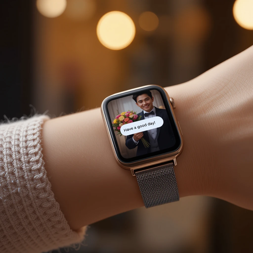 A person’s wrist is shown wearing a sleek smartwatch, displaying a heartwarming message from someone special. The screen shows a smiling young man holding a bouquet of colorful flowers, along with a text bubble that says, “Have a good day!” The warm background lights add to the cozy and affectionate atmosphere. This digital surprise brings a touch of happiness, showing how technology can be used to express care and love in modern relationships.