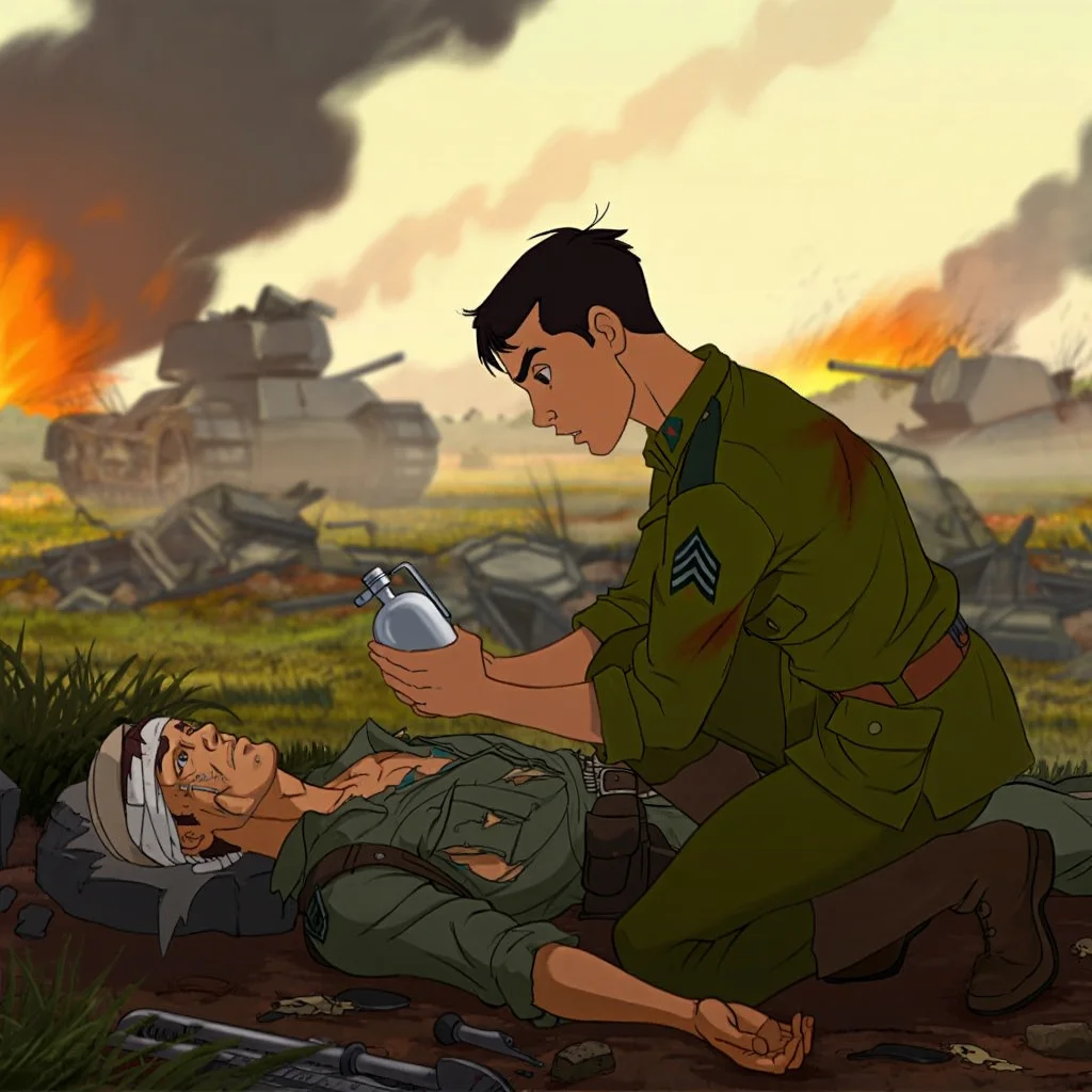 In a big war, James was a soldier. He fought bravely for his country. One day, he saw a wounded enemy soldier. The soldier looked scared and weak. James could have hurt him, but he didn’t. He gave him water and helped him sit up. The enemy soldier smiled weakly. “Thank you,” he whispered. James promised, “I will help you.” Years later, James met the soldier again. They weren’t enemies anymore. They shook hands and walked away together. Kindness in war can bring peace. |