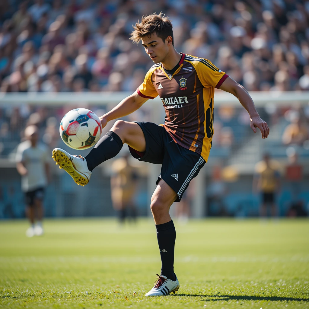 A young soccer player is skillfully juggling the ball with his foot in the middle of a game. He wears a brown and yellow jersey with black shorts, representing his team. His expression is focused, showing his concentration and control over the ball. The stadium is filled with spectators, creating a vibrant and competitive atmosphere. Other players in similar jerseys can be seen in the background, watching the play unfold. The sun casts a warm light on the field, emphasizing the intensity of the match.