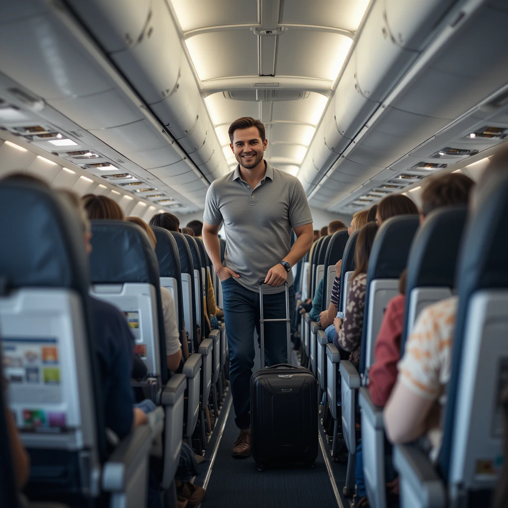 A well-dressed man with a confident smile walks down the aisle of an airplane, pulling his carry-on luggage behind him. He looks relaxed and excited, possibly heading to his seat or searching for an empty overhead compartment. Other passengers are already seated, some chatting, while others are focused on their in-flight entertainment. The airplane cabin is well-lit, with rows of seats neatly arranged and overhead bins open. The scene captures the anticipation of travel, a moment before takeoff when adventure awaits.