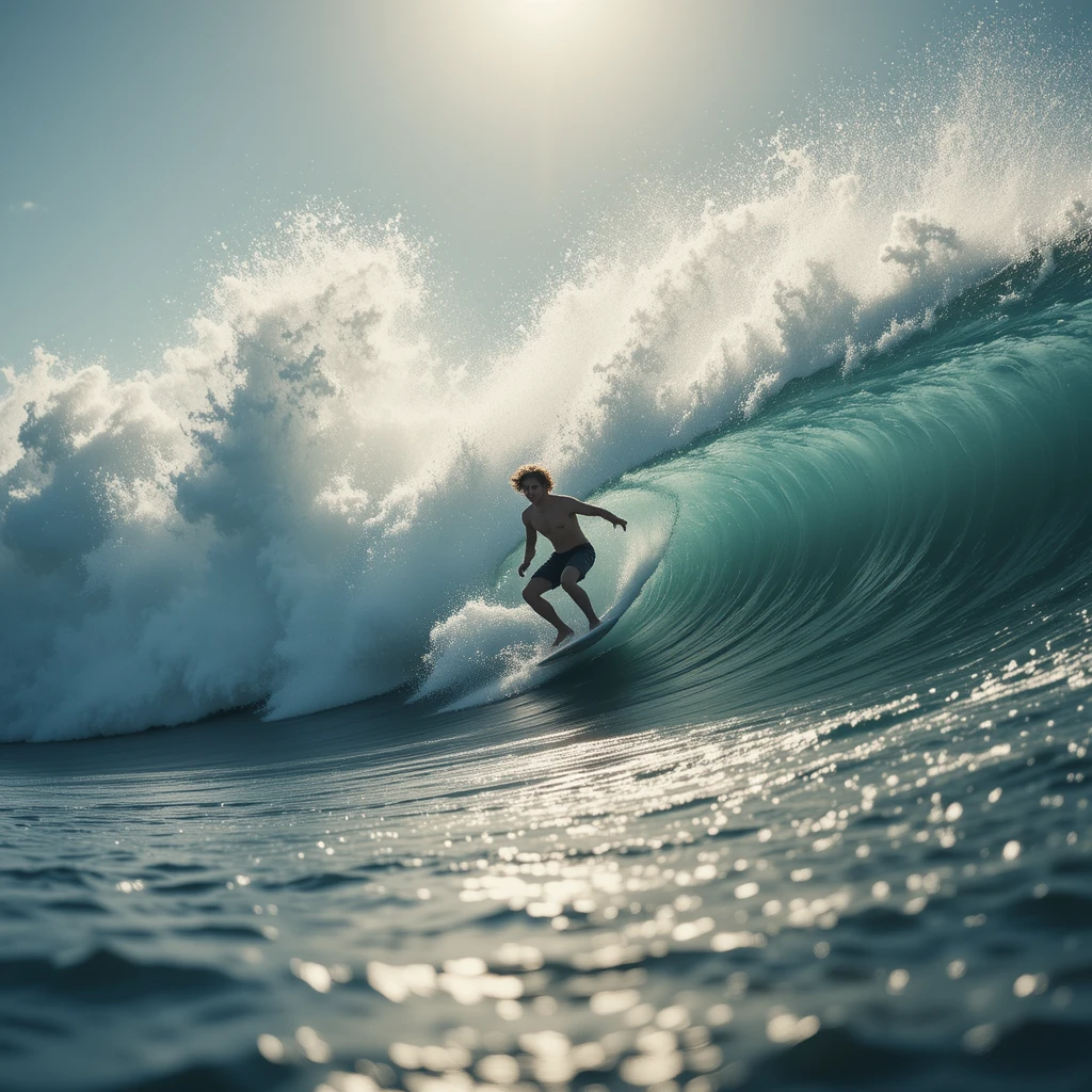 A surfer skillfully rides a towering barrel wave, perfectly balancing on his board. The sun reflects off the glistening water, adding a magical shimmer to the scene. The sheer power of the wave contrasts with the surfer’s graceful movements, showcasing both nature’s might and human skill. The crashing water behind him creates an electrifying moment, capturing the thrill and exhilaration of surfing.