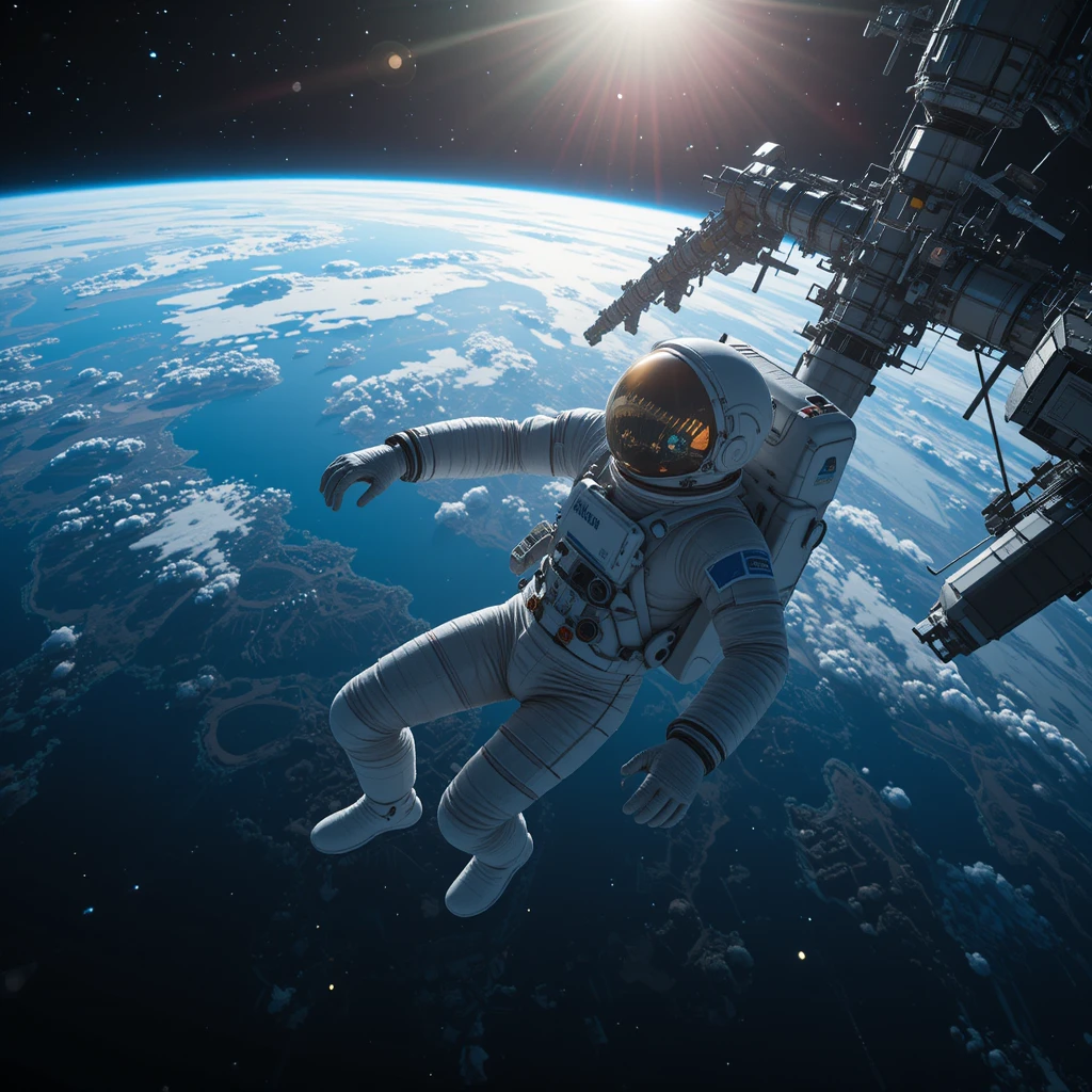An astronaut floats effortlessly in space, just outside the massive structure of a space station. The vast Earth, covered in swirling clouds, stretches out below, its deep blue oceans contrasting with the blackness of space. The golden light of the sun shines brilliantly, casting a glow on the astronaut’s reflective visor. The silence of the cosmos surrounds them, emphasizing the vastness and solitude of space travel.