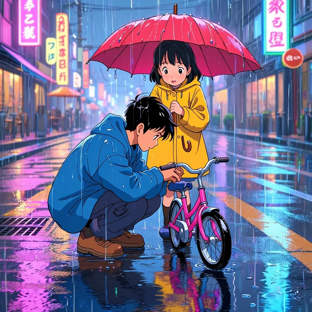 어느 날, 학교에서 집으로 돌아가는 길에 갑자기 검은 구름이 몰려왔다. 또 비냐… 그는 투덜거렸다. 그때, 길가에서 망가진 자전거를 바라보며 서 있는 어린 여자아이를 보았다. 아이의 얼굴엔 초조한 기색이 역력했다.