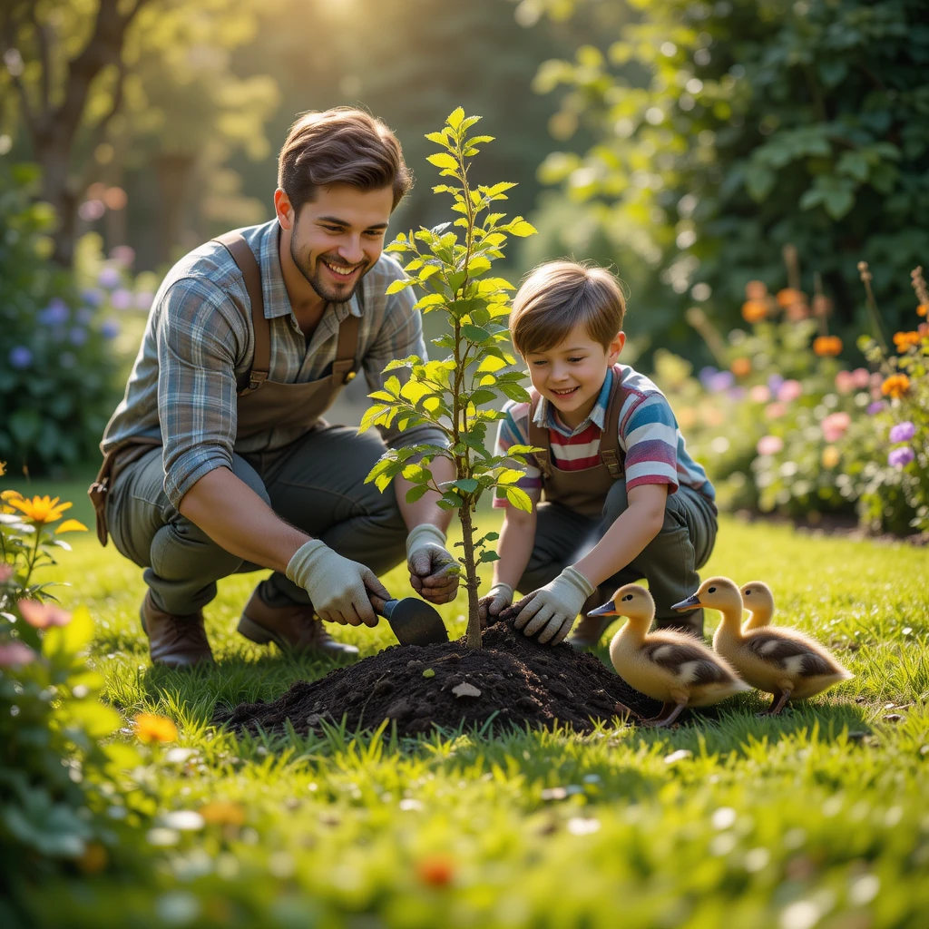 In a beautiful garden filled with blooming flowers, a father and his young son are planting a small tree together. They are both wearing gardening gloves and smiling as they carefully place the tree into the soil. Nearby, three little ducklings watch them with curiosity. The sunlight filters through the leaves, creating a warm and peaceful atmosphere. It’s a moment of bonding, learning, and appreciating nature.