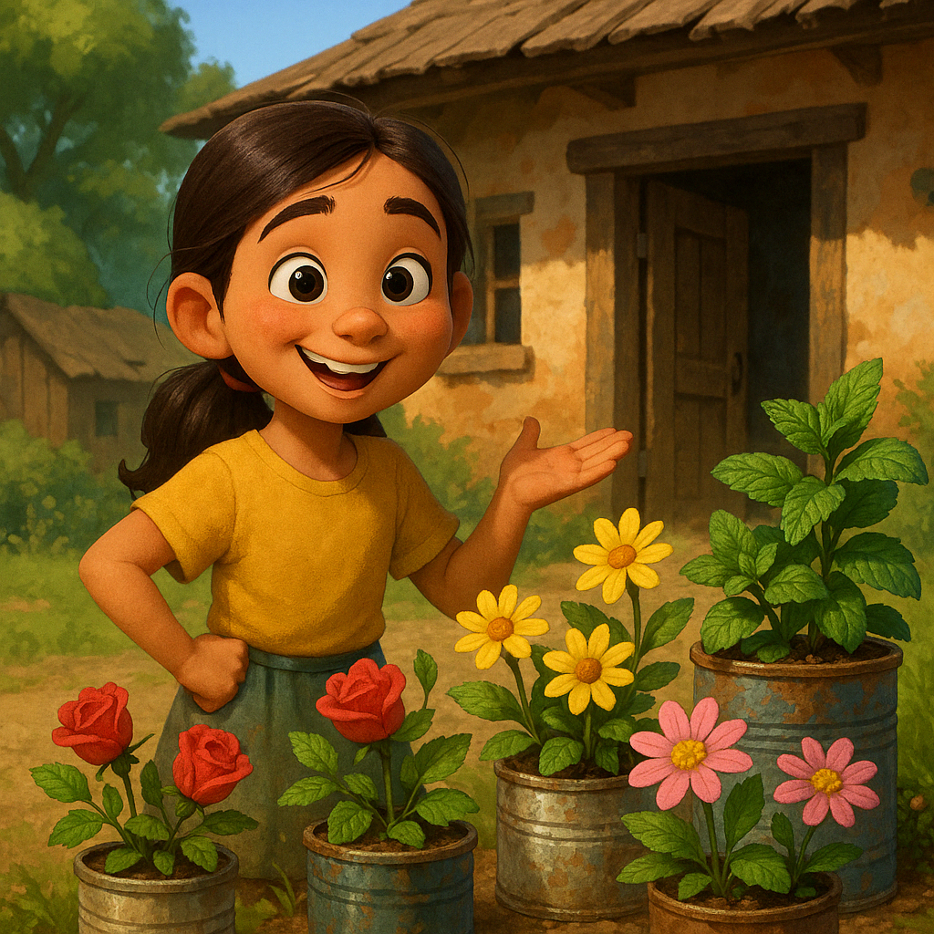 • Leena made a small garden using old cans.