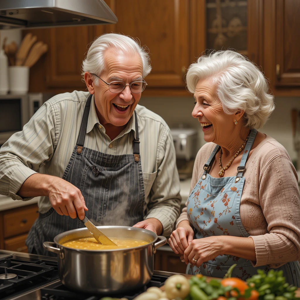 An elderly couple is happily cooking together in a cozy kitchen. The grandfather, wearing a striped shirt and a dark apron, is stirring a large pot of soup with a ladle. His wife, dressed in a floral apron, is standing beside him, laughing joyfully. The warm atmosphere of the kitchen, with fresh vegetables on the counter, makes the scene feel homely and comforting.