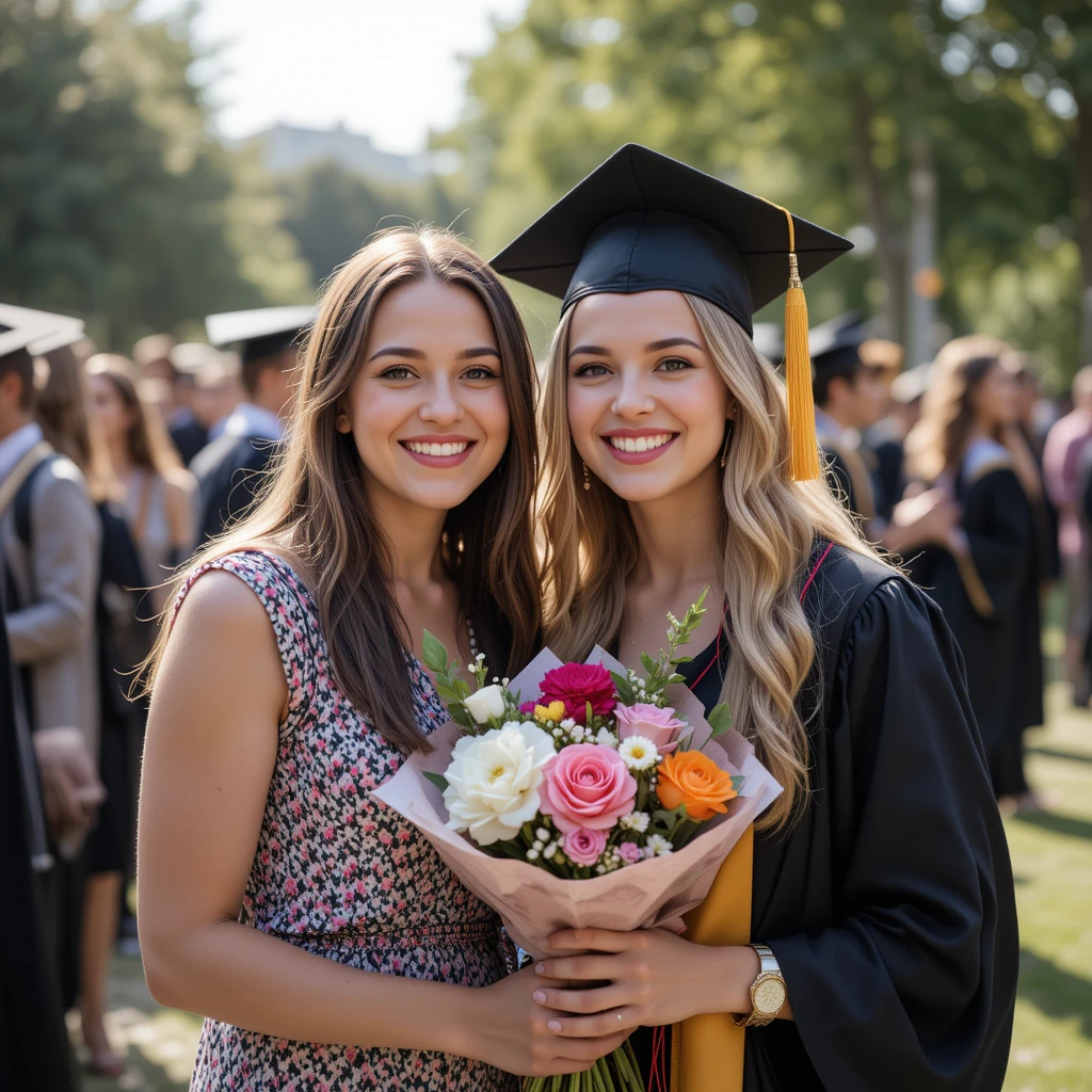 In the image, two young women are smiling brightly at a graduation ceremony. One of them is wearing a black graduation gown and cap with a golden tassel, holding a colorful bouquet of flowers. The other woman, dressed in a floral dress, stands beside her, sharing in the joyful moment. In the background, other graduates in caps and gowns are gathered, celebrating their achievements. The outdoor setting, with green trees and sunlight, adds warmth and happiness to the scene.