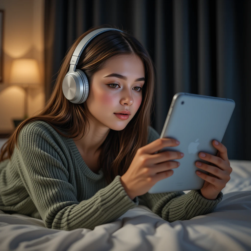 A young woman with long brown hair is lying on a bed, wearing a cozy green sweater and silver over-ear headphones. She is holding a silver Apple iPad, focusing intently on the screen. The room has a warm and relaxing ambiance, with soft lighting from a lamp in the background. Dark curtains cover the windows, adding a peaceful, intimate atmosphere.