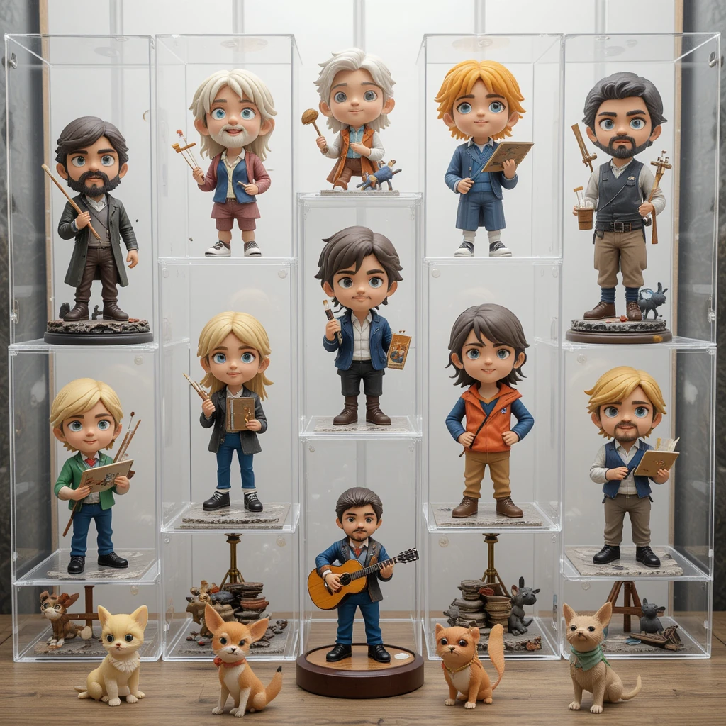 This image showcases an adorable collection of mini figurines displayed in transparent cases. Each character has a unique design, holding different objects like paintbrushes, books, musical instruments, and tools. Some appear to be artists, while others look like musicians, writers, or craftsmen. Their large, expressive eyes and detailed outfits give them a charming and whimsical appearance. Small animal figurines, including cats and mice, are placed around them, adding a playful touch to the scene.
