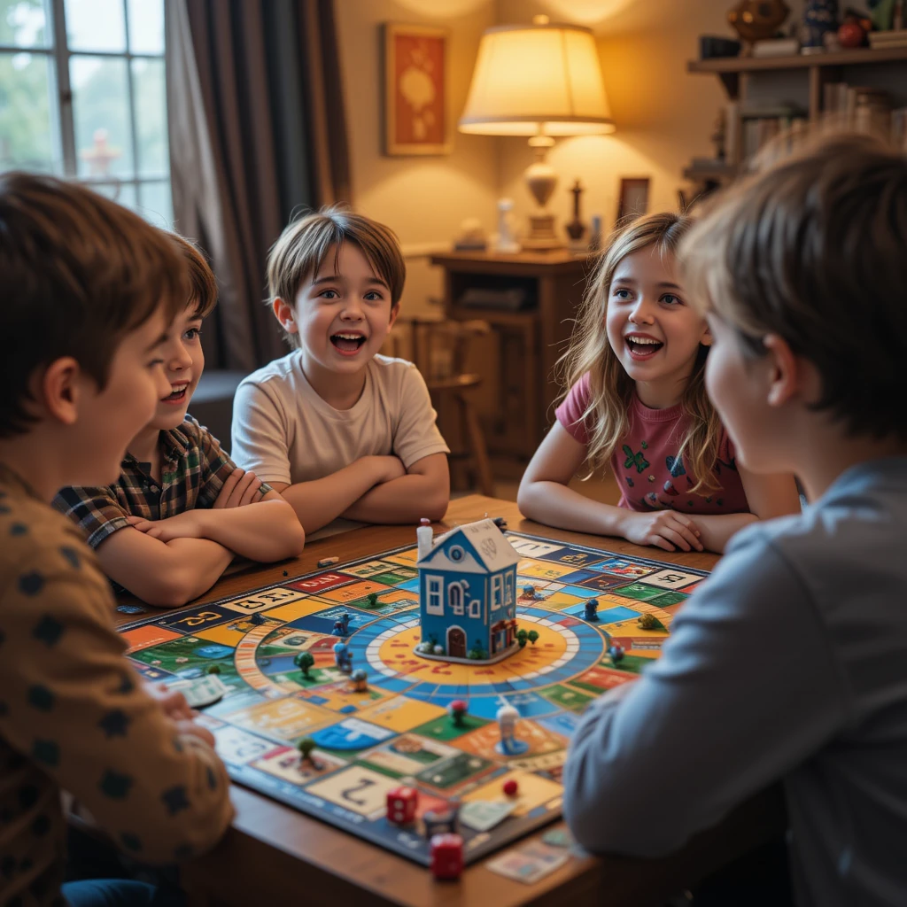 A group of children is sitting around a wooden table, playing a colorful board game. Their faces are full of excitement and joy as they eagerly watch the game unfold. A small house piece is placed at the center of the board, and dice are scattered across the table. The room is warm and cozy, illuminated by a soft lamp, creating a comfortable and friendly atmosphere. The children are fully engaged in the game, laughing and enjoying each other's company.