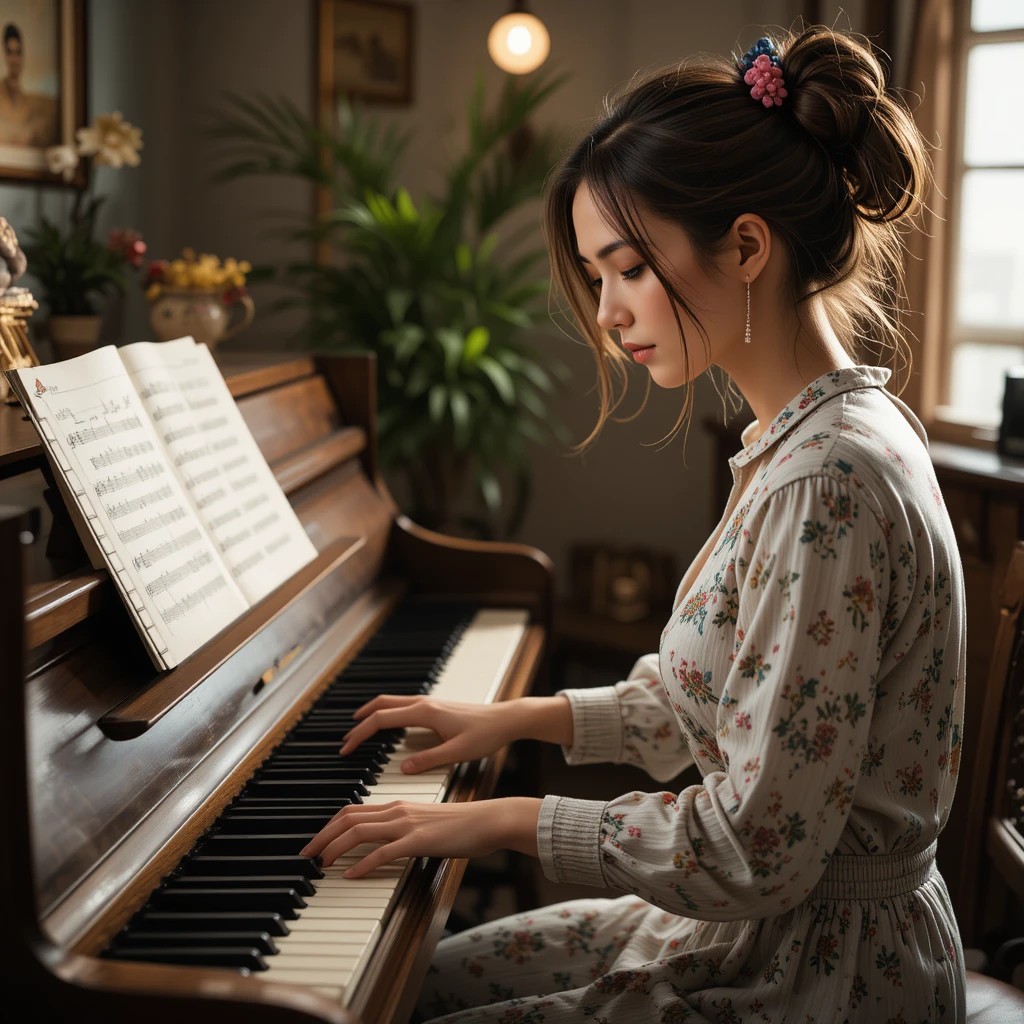 A young woman is playing the piano with deep concentration. She is wearing a vintage floral dress, and her hair is styled in an elegant updo with a decorative hairpin. The setting is a cozy room with warm lighting, potted plants, and framed pictures on the walls, creating a peaceful and nostalgic atmosphere. The open sheet music on the piano suggests that she is practicing a classical piece.