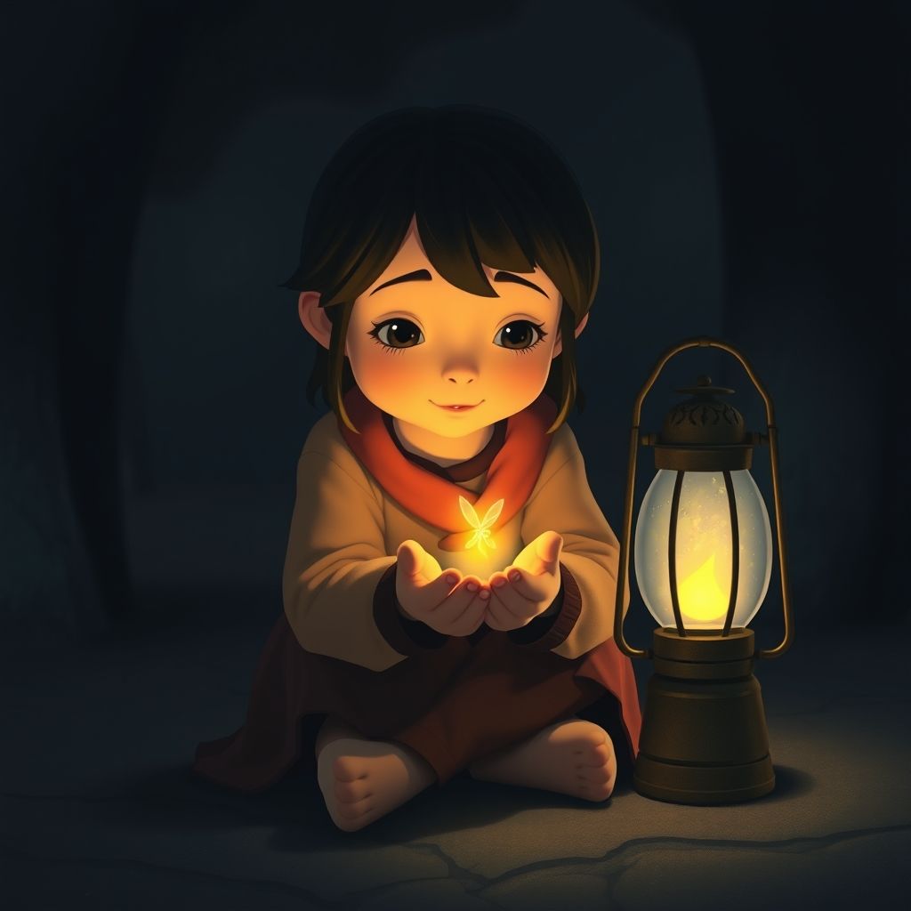 Mina sat in the dark. Her lantern was almost out. She had no more oil. She hugged her knees. She felt alone. She felt lost. Then, she saw a firefly. It blinked once. Then again. Mina smiled. She cupped her hands. The firefly landed inside. Its tiny glow warmed her heart. Hope was not gone. It had only changed shape. |