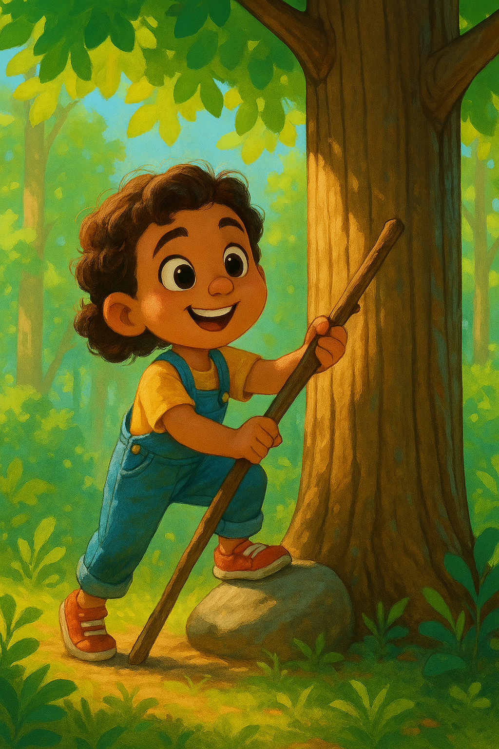 토바는 큰 나무를 봐요. 올라가고 싶어요. 나무는 아주 커요. 토바는 작아요. 막대기를 찾아요. 점프해요. 넘어져요. 돌을 찾아요. 다시 점프해요. 드디어 올라갔어요! 토바는 환하게 웃어요. |