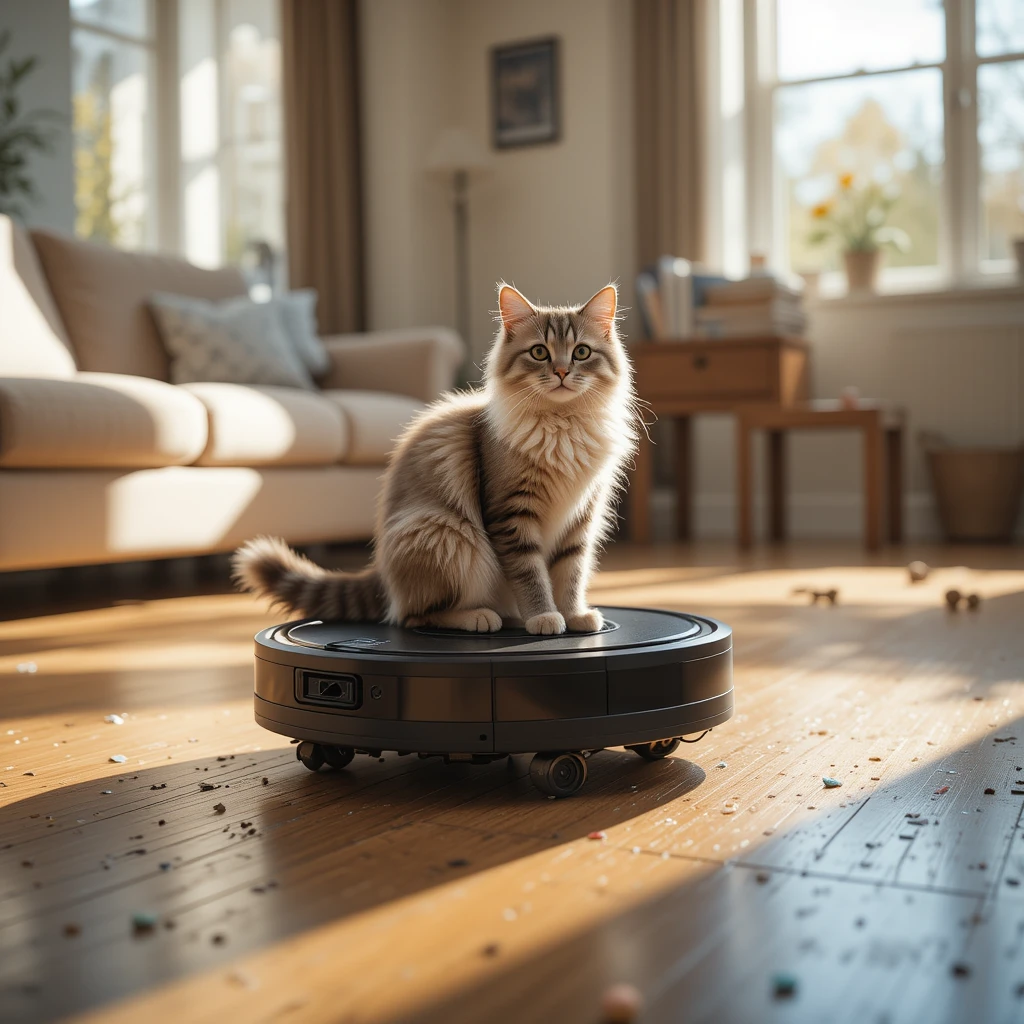 A fluffy cat is sitting on top of a robot vacuum cleaner in a cozy, sunlit living room. The cat looks calm and confident, as if it has claimed the vacuum as its personal throne. The floor is a bit messy with small pieces of debris scattered around, and the vacuum cleaner seems ready to start its cleaning mission. The sunlight streaming through the window gives the room a warm and inviting atmosphere.