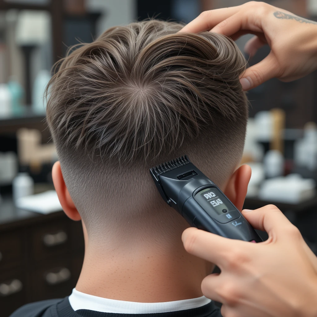 A young man is getting a stylish haircut at a modern barbershop. The barber is using an electric clipper to create a smooth fade on the back of his head. His light brown hair is neatly styled on top, while the fade gradually blends into the skin for a clean and sharp appearance. The barber’s steady hand ensures precision as they carefully trim the lower part of the hair. The atmosphere of the barbershop is professional yet relaxed, with grooming tools and products visible in the blurred background.