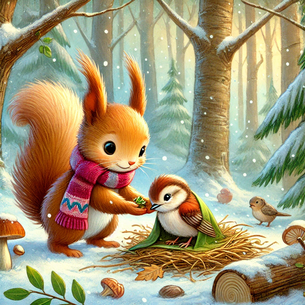 One cold winter morning, Pip the squirrel found Lila, a hurt bird. He made her a soft bed and gave her food. As she got better, they became friends. Later, Pip got stuck in the snow. Lila and her friends flew in and brought him food. “Goodness always comes back,” Lila said. |