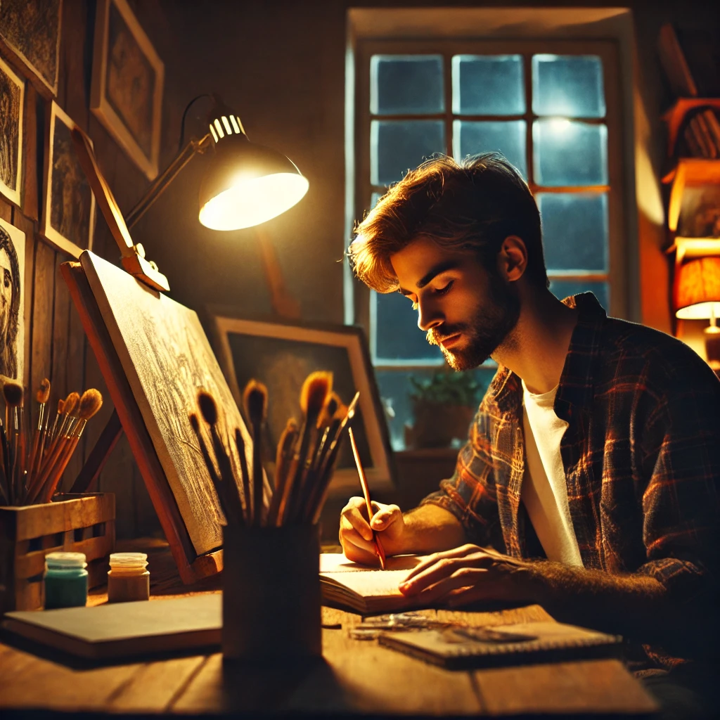 One evening, Felix secretly followed Leo to his studio, hoping to uncover the secret behind his success. Hiding behind the window, he watched as Leo painted. To his surprise, Leo wasn’t simply painting—he was studying old art books, experimenting with colors, and practicing tirelessly.