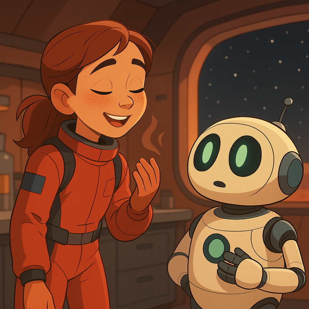 화성의 작은 실험실에서 열두 살 소녀 엘라라는 로봇 친구 티코와 함께 일하고 있었어요. 어느 날, 티코가 말했어요. “이 냄새 알아? 딸기 냄새 같아!” 엘라라는 웃었어요. “그건 에틸 포메이트라는 분자야. 과일 향이 나는 분자지!” 그녀는 별들을 바라보며 말했어요. “우주에서도 달콤한 놀라움이 우리를 찾아오네.” |