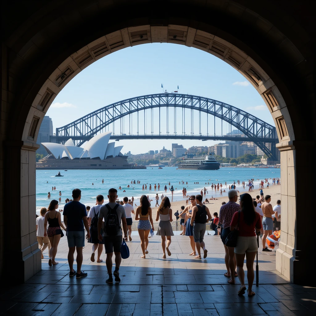 People are walking through an archway towards a lively beach with the Sydney Harbour Bridge and Opera House in the background. The sun is shining brightly, and the beach is filled with tourists and locals enjoying the warm weather. Some are heading towards the water, while others are taking photos or relaxing by the shore. The view perfectly captures the vibrant and picturesque essence of Sydney.