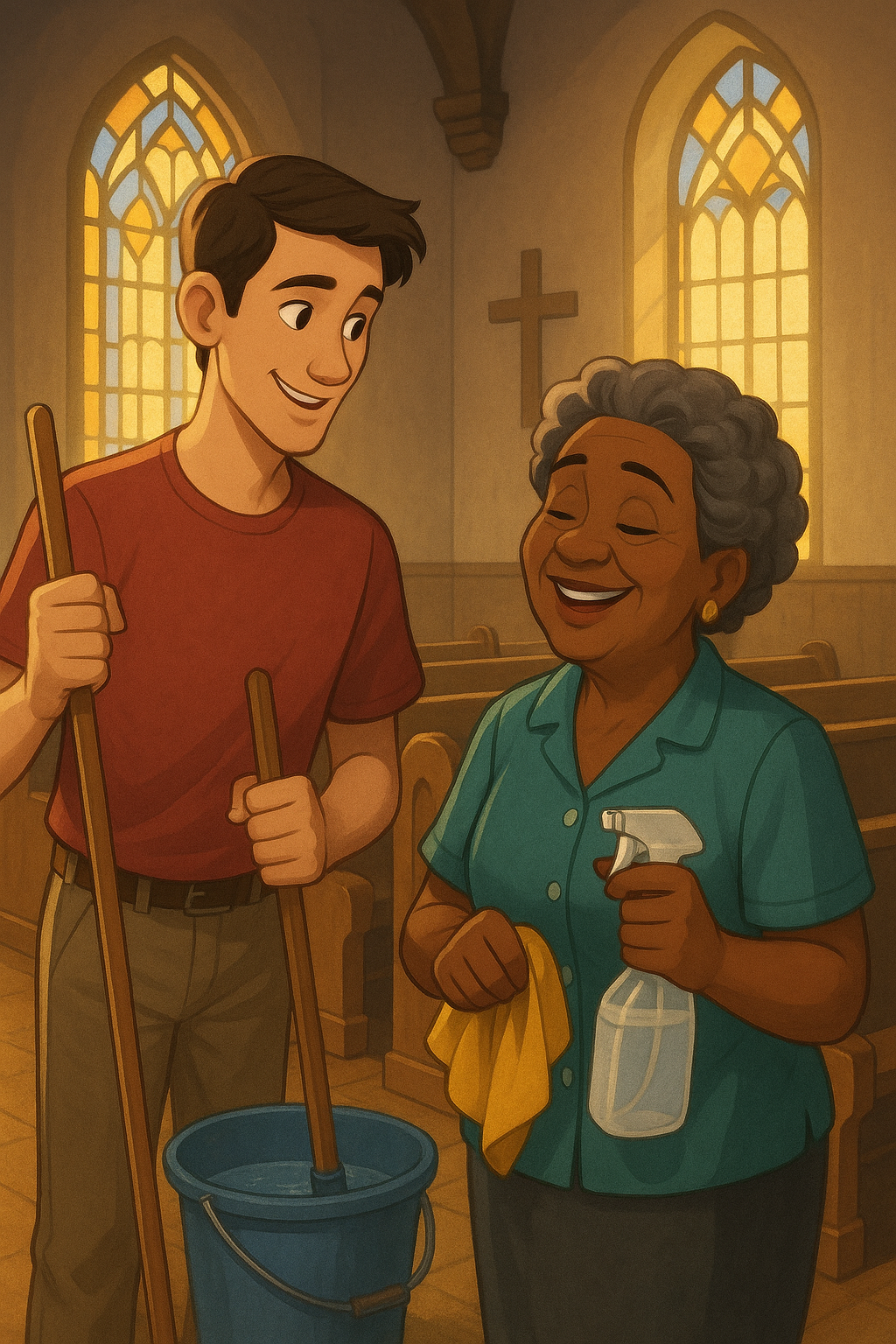 The afternoon brought harder tasks—cleaning the stained-glass windows and reorganizing storage closets.