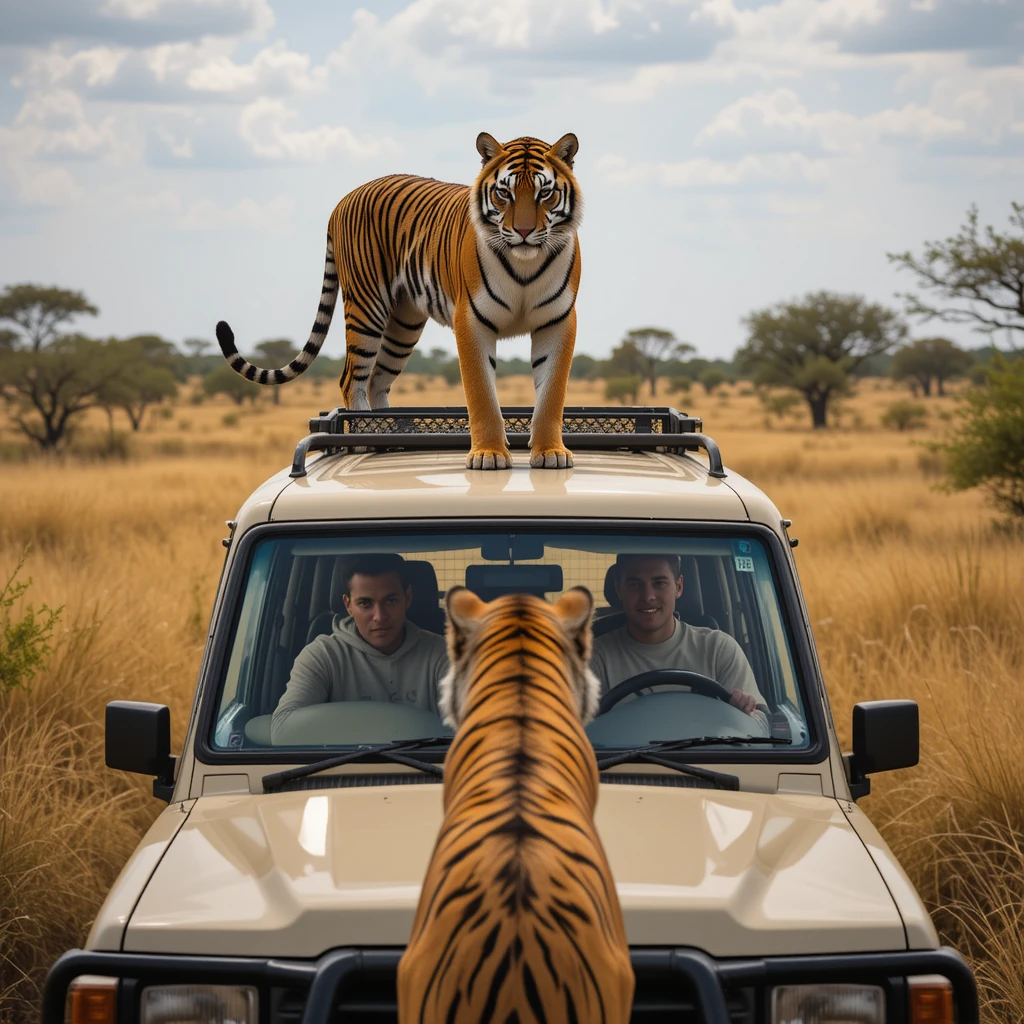 The image captures a thrilling moment in the middle of a safari. Two men are sitting inside a beige off-road vehicle, seemingly frozen in place, as two majestic tigers surround them. One tiger confidently stands on top of the car, staring directly at them, while another blocks their way in front. The golden grasslands stretch into the horizon, emphasizing the vast wilderness. The atmosphere is a mix of awe, fear, and excitement, making this an unforgettable encounter.