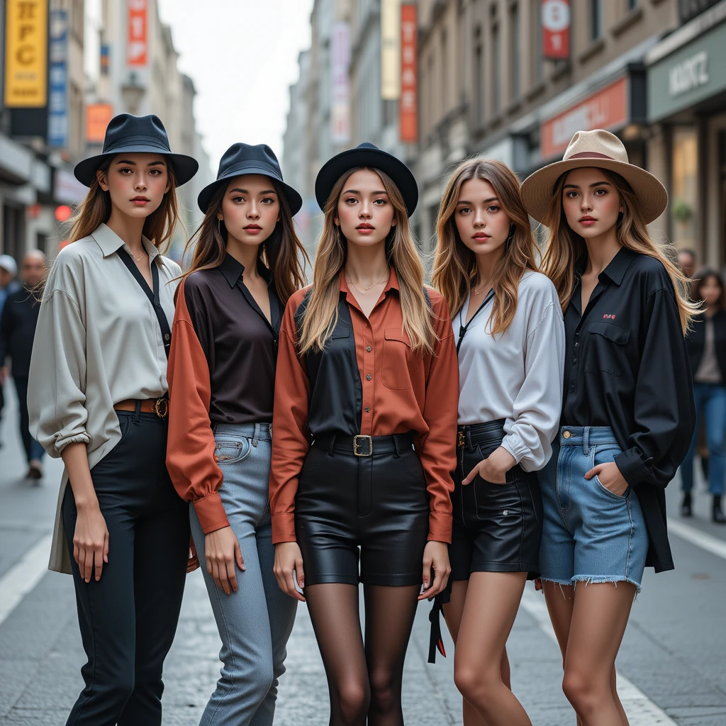 This image showcases five stylish women walking confidently down a city street. They are dressed in elegant yet modern outfits, featuring sleek blouses, tailored pants, and trendy hats. Their poised expressions and striking fashion choices radiate confidence and sophistication. The neutral and earthy tones of their outfits create a cohesive, polished aesthetic, making them stand out effortlessly against the urban backdrop.