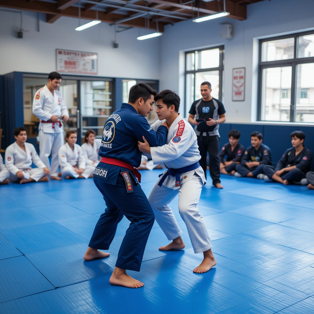 In a Brazilian Jiu-Jitsu gym, two competitors in gis—one wearing a navy blue gi with a red belt and the other in a white gi with a blue belt—are engaged in a gripping stand-up exchange. They are holding each other's lapels and sleeves, looking focused and determined. A referee, dressed in black, is closely observing the match, holding a tablet in his hand. Several students in white and black gis are sitting on the mat, attentively watching the fight. The gym is well-lit, with large windows allowing natural light to fill the room, and the blue mat contrasts with the athletes' uniforms.