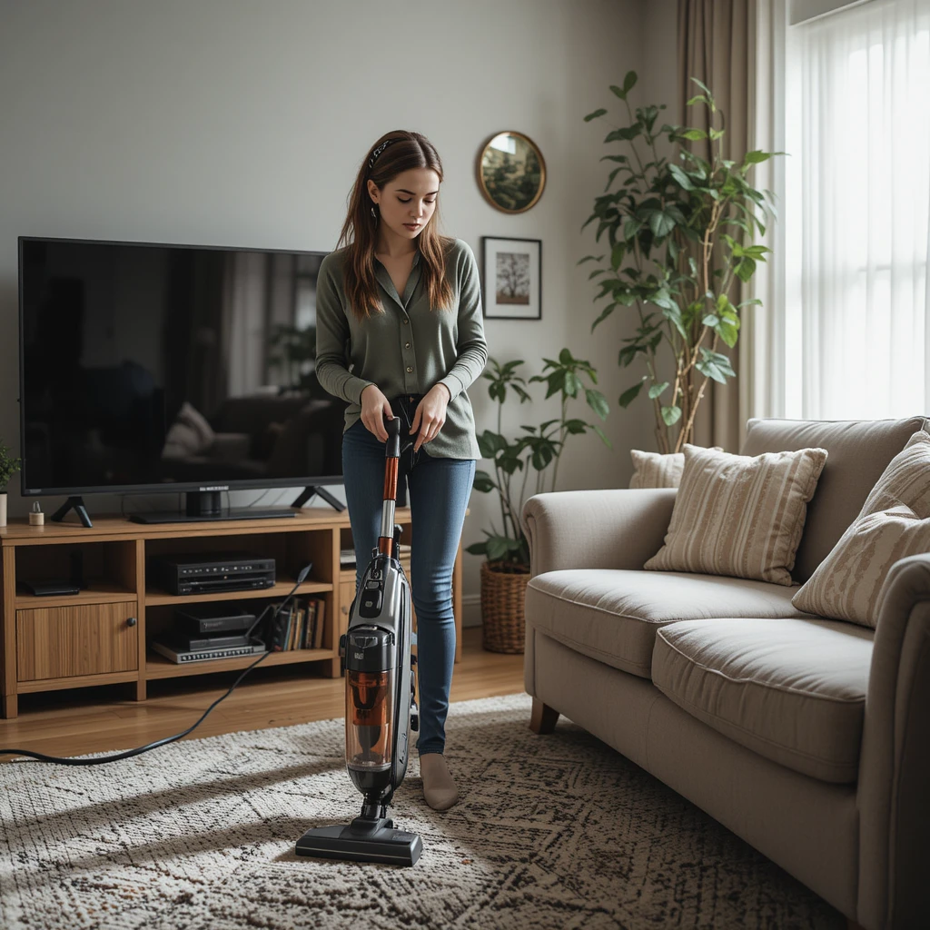 A young woman is vacuuming the carpet in her cozy living room. She is wearing a green cardigan and jeans, focusing on cleaning the floor. The room is well-decorated with a comfortable beige sofa, several cushions, and lush green plants. A large TV is placed on a wooden stand, adding to the modern and warm atmosphere of the space. Sunlight streams in through the window, making the scene feel bright and peaceful.
