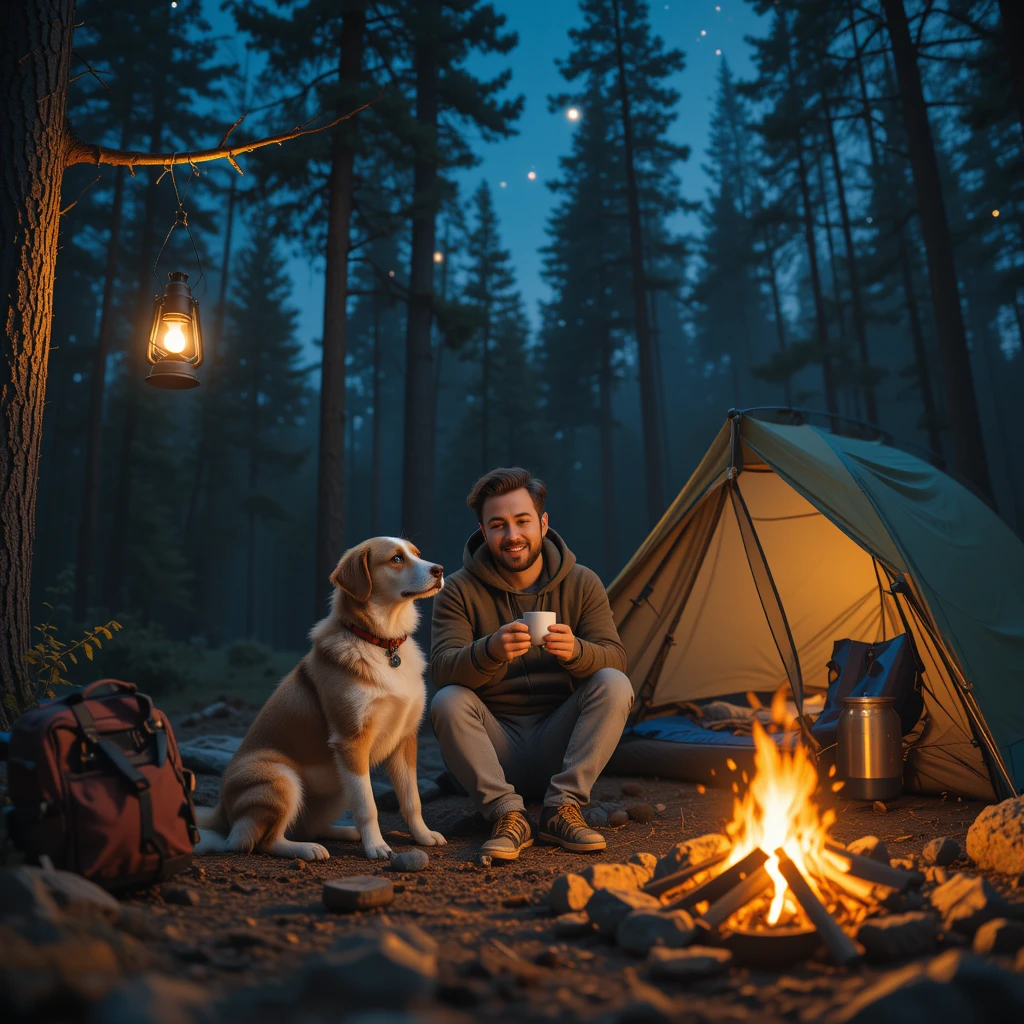 The image depicts a man sitting near a cozy campfire in a dense forest at night, enjoying a warm drink. He is wearing a hoodie and comfortable outdoor clothes, looking relaxed and happy. Beside him, a loyal dog sits attentively, gazing at him. A tent with soft lighting is pitched nearby, creating a peaceful and inviting atmosphere. A backpack and a lantern hanging from a tree add to the sense of adventure. The night sky is dotted with tiny glowing stars, making the scene feel magical and serene.