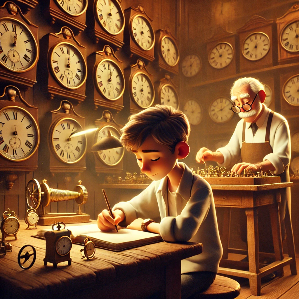 그러던 어느 날, 노련한 시계공인 콜린스 씨가 그에게 말했어요. "네가 누구인지 알고 싶다면, 네 시간이 어디로 가는지를 보게. 시간은 절대 거짓말하지 않아." 이선은 그 말이 이해되지 않았지만, 그의 하루를 기록해 보기로 했어요. 작은 노트를 준비해 매시간 어떻게 보냈는지 적었어요. 그리고 일주일 뒤, 그는 충격을 받았어요. 핸드폰을 보며 시간을 허비하고, 어려운 일을 피하고, 자신의 꿈을 미루는 데 많은 시간을 쏟고 있었던 거예요. 마음이 불편해진 이선은 결심했어요. 그는 우선순위를 정하고, 아침 일찍 일어나 책을 읽고, 자신의 기술을 갈고닦으며, 소중한 사람들과 시간을 보내기로 했어요. 그러자 조금씩 그의 삶이 변하기 시작했어요. 1년 후, 이선은 예전에 적어 둔 노트를 다시 펼쳐 보았어요. 그리고 미소 지었어요. 그는 깨달았어요. 자신이 원하던 사람이 된 것은 남들에게 묻고 다닌 것이 아니라, 자신의 시간을 어떻게 쓰느냐를 바꾼 덕분이었다는 것을. |