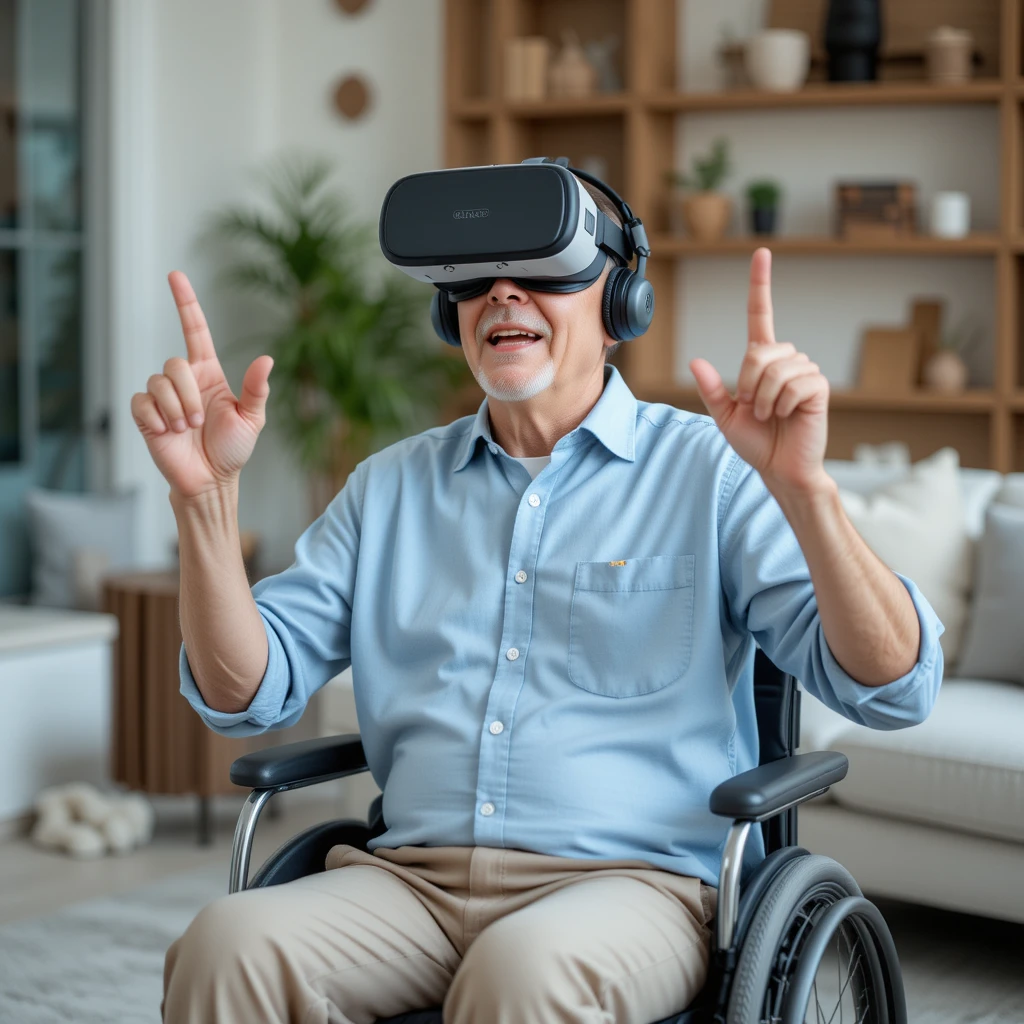 A middle-aged man with a neatly trimmed beard is sitting in a wheelchair, wearing a virtual reality headset and headphones. He is dressed in a light blue button-up shirt and beige pants, and he appears to be fully immersed in a virtual world. His facial expression shows excitement and amazement as he raises both hands with his index fingers pointing upward. The background features a cozy, modern living room with wooden shelves, decorative items, and a potted plant, creating a warm atmosphere.