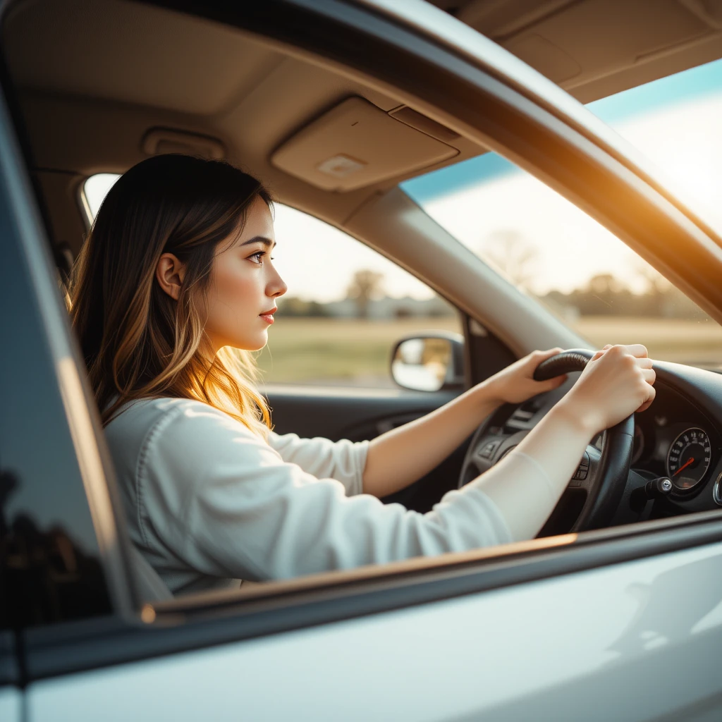 A young woman is driving a car with a focused expression. The warm sunset light shines through the window, highlighting her face. She holds the steering wheel firmly, looking straight ahead. The background shows a peaceful countryside with trees and an open road.