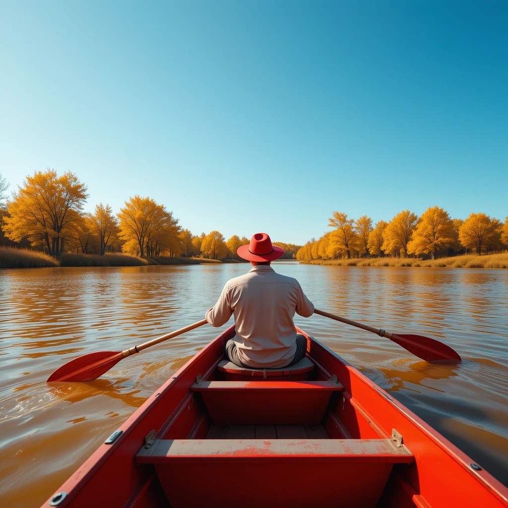 A person wearing a red hat is rowing a red boat along a calm river, surrounded by golden autumn trees. The sky is clear and blue, creating a striking contrast with the warm hues of the foliage. The water reflects the vibrant trees, enhancing the peaceful and picturesque scenery. The person appears to be fully immersed in the moment, enjoying the solitude and tranquility of nature. This image beautifully captures the essence of autumn adventure and relaxation.