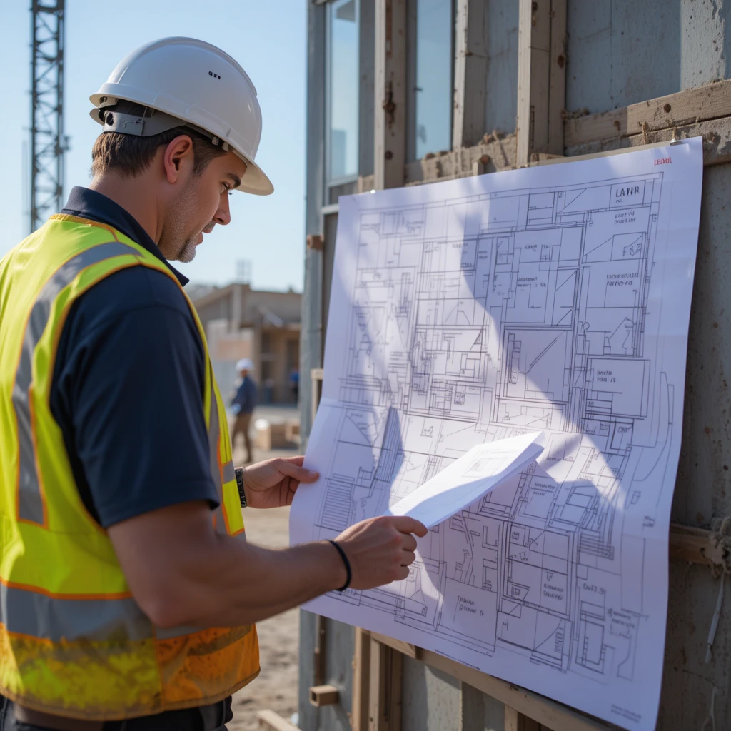 A construction engineer is carefully examining a large blueprint on a job site. He is wearing a white hard hat and a high-visibility safety vest, ensuring safety while working. The blueprint contains detailed architectural drawings, indicating that he is reviewing the structural plans of the building. In the background, there are construction materials, workers, and unfinished structures, showing that the project is in progress.