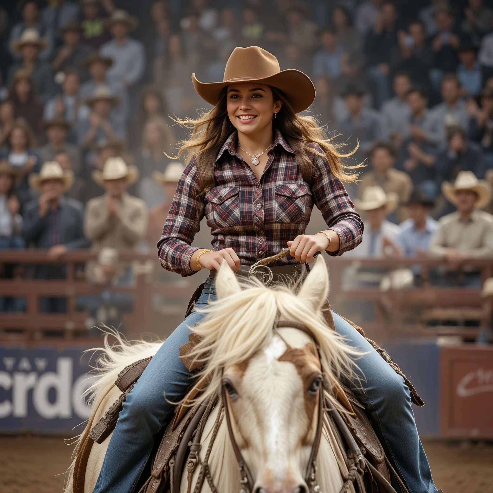 A young woman dressed in a plaid shirt and cowboy hat is riding a beautiful white and brown horse in a rodeo arena. She has a bright smile on her face, showing her confidence and joy. The crowd behind her is clapping and cheering, creating an exciting atmosphere. She holds the reins firmly, controlling the horse with ease as they move forward.