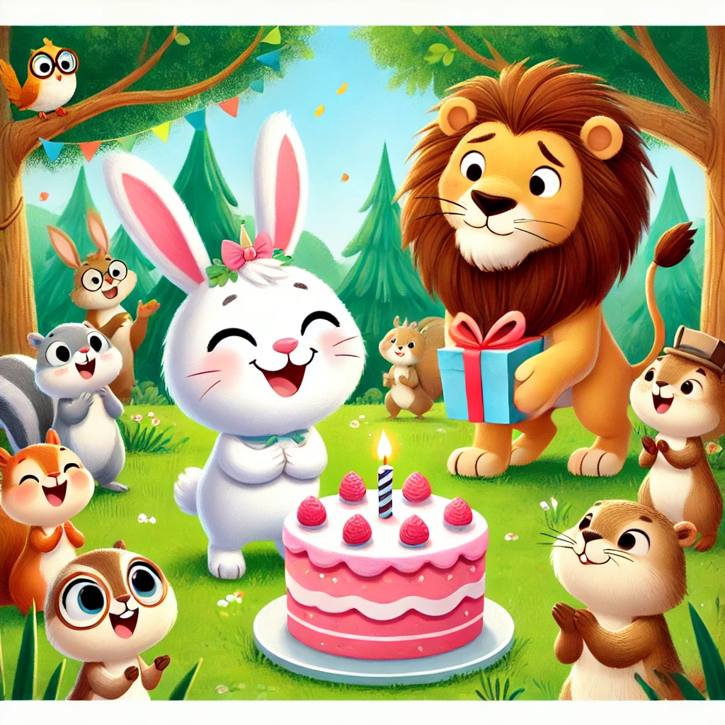 It was Bunny’s birthday. All the animals came. They sang and danced. Then—ROAR! A lion came! Everyone was scared. But the lion smiled. “I have a gift,” he said. The lion gave Bunny a toy. “Thank you!” said Bunny. The animals laughed and played. Now, the lion is a friend. |