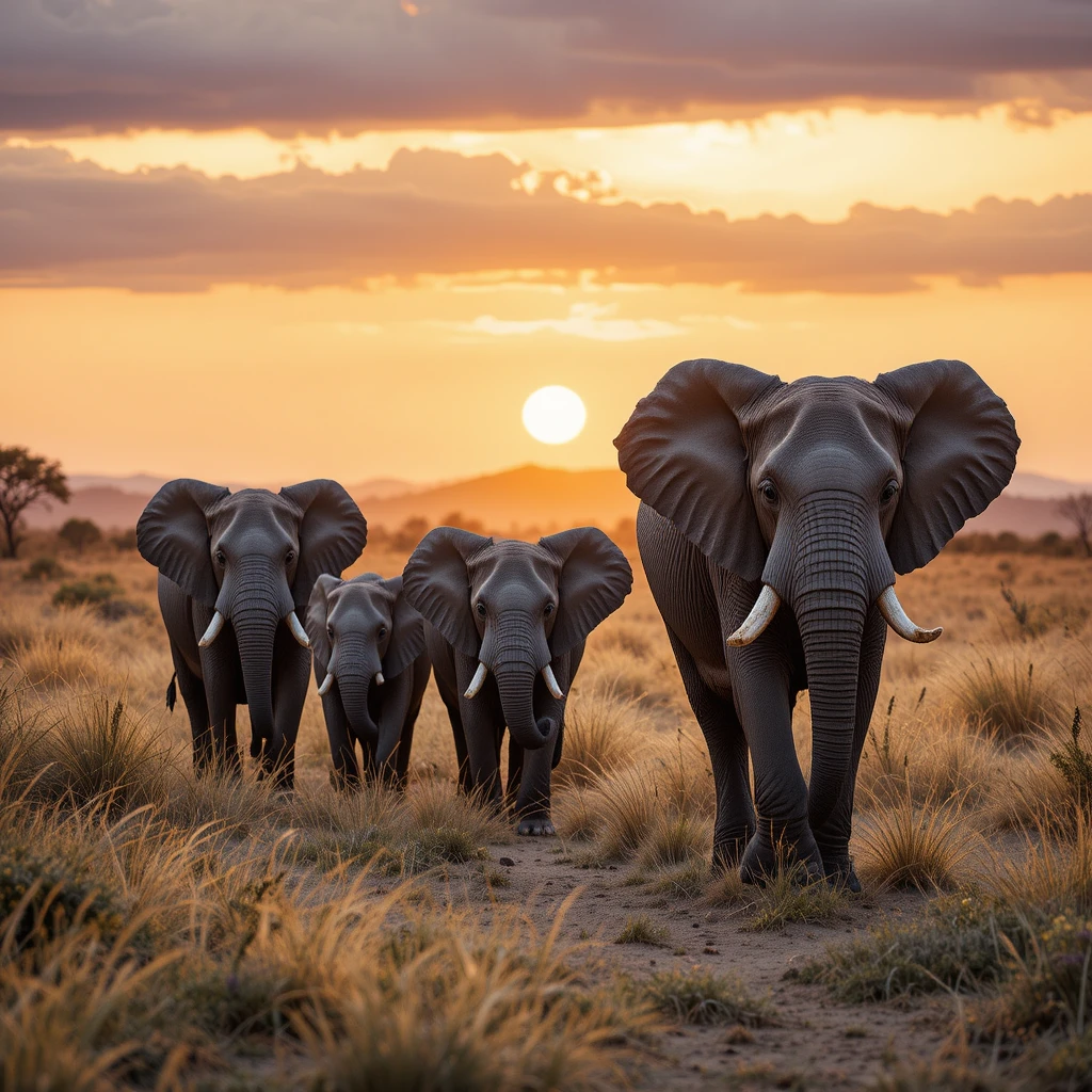 - 🔹 A herd of elephants walked through the grassland.